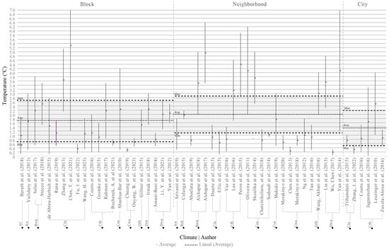 The vegetation’s cooling-effect analysis primarily concentrated on a specific period, especially a single season. Most of the studies were conducted in the summer (60.6%), with a minority in the spring, autumn, and winter. These results show a more significant cooling trend in summer. According to Cohen et al. [89], the largest cooling impact occurs during the summer and winter daytime hours. While Hamada and Ohta [90] and Zhang et al. [91] find a high-temperature difference between urban and green areas in the summer and a low difference in the winter, it is recommended to carry out studies in each of the seasons (e.g., spring, autumn, and winter) or longitudinal studies to understand the changes in the effects of the vegetation on the thermal microclimate in each season. Additionally, it was observed that 22.0% of the studies were monitored all day; however, in some cases, the mitigation reports did not specify the monitoring time. Nevertheless, reporting this data can facilitate the meta-analysis.