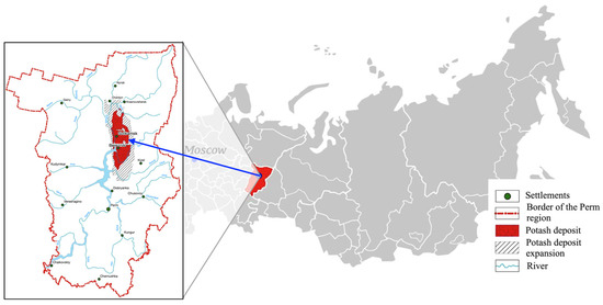 The Verkhnekamsk deposit is one of the world’s largest potash deposits. It is located in Russia, in the Western Urals, in the Perm region (Figure 1). The Verkhnekamsk potassium–magnesium salt deposit is the main component of the Solikamsk potassium-bearing basin, located in the left-bank part of the Kama river valley. In the north, this deposit is limited by Lake Nyukhti, located in the Krasnovishersk region; in the south, it extends to the Yayva river basin. The length of the explored part of the deposit from north to south is 140 km, from west to east, about 60 km, and the total area is 3500 km2. The thickness of the ore-bearing strata is about 80 m, and its depth is 400 m. The deposit consists of understratum rocksalt, potassium and potassium–magnesium salts, and mantle rocksalt. Potash horizons are represented by alternating red-layered sylvinites with rock salt interlayers. The thickness of individual potash strata ranges from 0.75 to 5 m. The deposit was formed 250 million years ago as the Perm Sea dried up. It contains 69.5% of potassium, 19.7% of magnesium, and 56.6% of rock salts from the total Russian balance reserves.