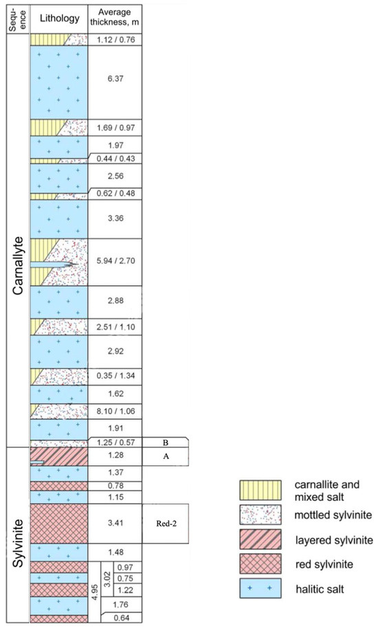The stratigraphic sequence of the region is shown in Figure 2. The Verkhnekamsk deposit consists of two major evaporite sequences. The upper sequence, the carnallite sequence, mainly comprises halite with interbedded layers of variegated sylvinite, carnallite, and mixed salts. The base of this sequence contains a horizon of variegated sylvinite, approximately 1.25 m thick, termed the B horizon. The lower sequence, the sylvinite sequence, is made up of red and banded sylvinite horizons interbedded with halite. There are six sylvinite horizons, which, from the top to the base of the sequence, are termed A, Red 1, Red 2, Red 3a, Red 3b, and Red 3v. The bottom three horizons have thin (<1 m) intercalations of halite and are combined to form the Red 3 horizon. The top horizon A occurs directly beneath the B horizon from the carnallite sequence, and these are combined to form the AB horizon. Commercial sequences are Red 2 and AB (silvinite). The average thickness varies from 3.1 m to 5.1 m. The content of potassium chloride in the Red 2 seam is 23.2 ÷ 32.4%, and in the AB seam it is 5.8 ÷ 60%.