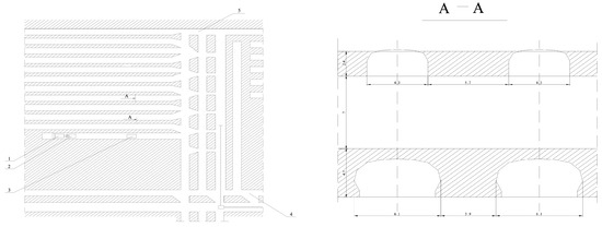 The Verkhnekamsk deposit is characterised by free-of-water salts and water-bearing host rocks. This deposit has an overlaying, thick aquifer. The rocks above the mineable seam, including the sylvinite–carnallite zone, mantle rocksalt, and the lower part of salt-marl strata, are 75–105 m thick watertight strata, which prevents suprasalt water from penetrating into the mined space. The need to preserve the continuity of watertight strata is a determining factor in the choice of mining method parameters [34]. Such conditions require the use of the mining method with stope support [11,13,35]. At present, room and rib pillar mining are used (Figure 3). This method is characterised by high mineral losses—up to 65% [36]. The remaining pillars should provide rigid support for watertight strata or smooth deformation without breaking their continuity. The width of room is equal to the width of the combine’s executive body and the free movement of vehicles [37], and the width of pillars varies from 5.2 m to 10.4 m depending on specific mining and geological conditions.