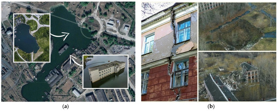 Destruction of surfaces and buildings as a result of a man-made disaster in 2006 (Perm region, Russia): (a) sinkhole at the territory of an administrative facility, 2011; (b) sinkhole at the territory of a school, 2015, Berezniki.