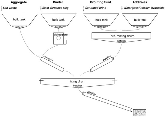 The scheme of hardening backfill preparation is presented in Figure 7. The binder, through the batcher, enters the disintegrator for activation and crushing to the required particle size distribution. Activated binder and aggregate are fed alternately onto a conveyor and fed in layers into the mixing drum. The grouting fluid and activating additives are pre-mixed and fed into the mixing drum via a pipeline through the batcher. In the mixing drum, the whole mass is mixed and then transported to the rooms by pipeline. Backfill quality control is carried out on the basis of ready-mix output. The laboratory of the complex determines the composition, density, specific gravity, fluidity, delamination, and percentage of components. On the basis of the obtained data, adjustments are made to the composition.