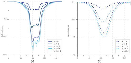 Modelling using a rheological model of rocks described by Norton’s [92,93,94] law of creep has confirmed the prospectivity and feasibility of several-stage stoping. Modelling was performed in FLAC software by Itasca Consultants GmbH. Figure 10 shows the results of vertical deformation measurements at 15 m (Figure 10a) and 50 m (Figure 10b) vertically from the seam roof after 13, 85, 153, 360, and 3600 days. As expected, the deformations increase with the formation of each new room. However, there is a decrease in the deformation intensity with the hardening of the backfill and ensuring the bearing capacity. The modelling results provide insight into vertical deformation in the long term. Most of the vertical deformation occurs for up to 153 days. Such dynamics can be explained by the presence of unfilled rooms and the gradual strengthening of backfill. After the 153rd day, vertical deformations slow down, and after the 360th day, they practically stop. This indicates that backfill has gained its total strength and has assumed the entire load, and room gaps have been filled by previously deformed and collapsed roofs. In the interval from 360 to 3600 days, practically no deformation changes are expected.