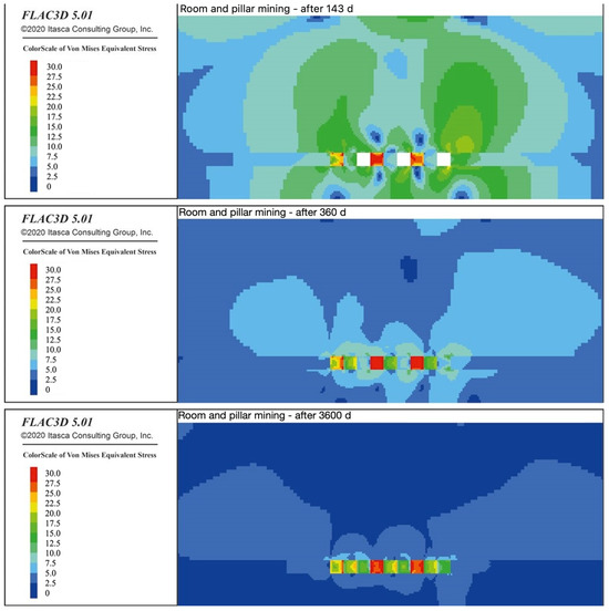 Figure 11 shows contour plots of stresses for days 143, 360, and 3600 after the start of mining. The modelling of salt mass behaviour in the mining area demonstrates a sharp decrease in stress after day 143. After 360 days, the highest stresses are expected only in the immediate vicinity of the backfill. After 3600 days, the investigated seam takes a state close to the natural one. After completion of stowing in phase III, abrupt stress–strain changes in the mass are unlikely.