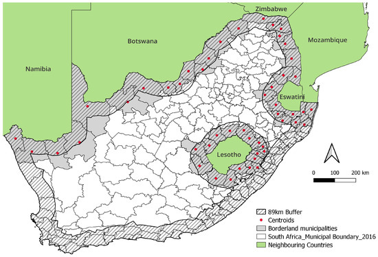 The 89 km served as a quantitative borderland delineation to identify borderland municipalities within South Africa’s 2016 municipal boundary layer. Using QGIS, municipal boundary polygons were first converted into centroids. All centroids within the 89 km of the political boundary line were categorised as borderland municipalities. The non-borderlands were inland beyond 89 km or the coastal area. There are 48 borderland local municipalities and one borderland metropolitan municipality. Joe Morolong Local Municipality displays a special case which is accounted for in the delimitation process. Although its centroid is outside the buffer, the municipality is directly located along the international land boundary line, making it inherently a borderland municipality. Thus, Joe Morolong is included as part of the 48 borderland local municipalities (Figure 1).
