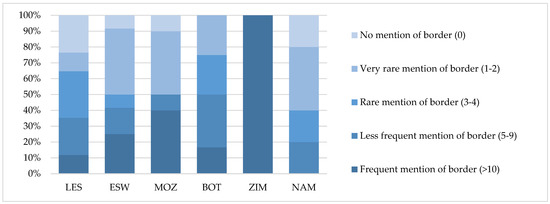 Data derived for the border regions reveal the local characteristics since it focuses on the occurrence of the keyword border in relation to the neighbouring countries. In this respect, it is evident that the municipalities bordering Zimbabwe (2) all consider borders important. Thus, these two local municipalities (Thulamela and Musina) fall into the category of frequent mentioning (Figure 2). It is worth noting that for the municipalities bordering Lesotho, the importance of the border seems to be the ‘least interesting’ (over 60% falls into the rare, very rare and no mention classification). In terms of frequency (more than five mentions in the IDP), the municipalities along the borders with Zimbabwe, Botswana and Mozambique are on top, exceeding 50%—although it should also be considered here that the municipality concentration (MC) of these three countries, the average size of the area and the population size of these municipalities are all different. The explanation for the relatively high number of references to the border can be found in the shared physical geographical features, and it is explained in the thematic section.