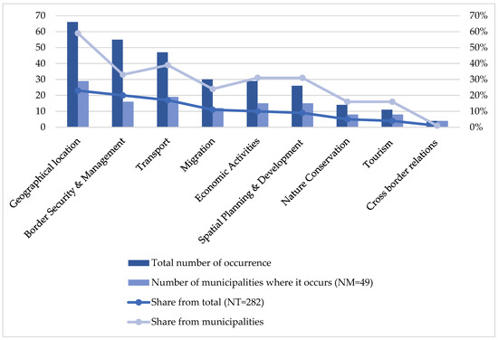 Thematic considerations of the occurrence of the keyword ‘border’ in the IDPs by their total number of occurrences (NT = 282) and by the number of municipalities (NM = 49) where it occurs.