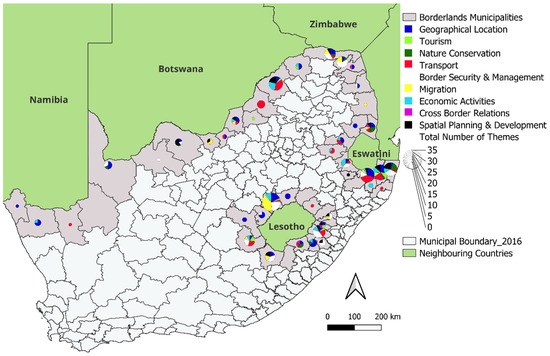 Mapping the frequency of mentioning the keyword border in terms of the thematic references by municipalities, the border regions along the borders with the six countries also show a distinct pattern. The number of mentions is the highest along the border with Eswatini and Lesotho and along the eastern part of the border with Botswana. Moreover, the thematic composition shows some signs of correlations: the mention of Transport is often paired with the mention of Economic Activities, while Migration and Border Security and Management also occur more frequently together in the IDPs of the same municipality. As these two-two themes may be considered interdependent, it suggests that a logically built and professionally well-supported approach is applied by the author(s) of the IDPs. The municipalities along the Namibian and Botswana borders have the lowest mention and the least diverse thematic considerations in general and in total. Contrary, the borders with Eswatini and Lesotho are the most diverse in terms of thematic diversity (Figure 4). These indicate a more intensive interest in borders, which suggests wider opportunities for potential cross-border activities.