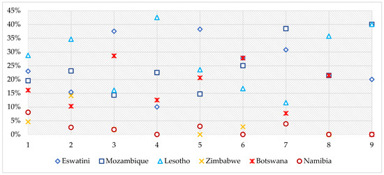 Based on further calculations and their analysis, it was found that the approaches for municipalities along the borders of South Africa can be divided into two distinct groups. Based on their common features, Namibia, Botswana and Zimbabwe are listed in Group 1, and Eswatini, Mozambique and Lesotho form Group 2 (Figure 5).