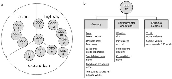 (a) Multiple ODDs within the superordinate driving domain classes urban, extra-urban and highway; and (b) first and second levels of ODD taxonomy according to The British Standards Institution [2].