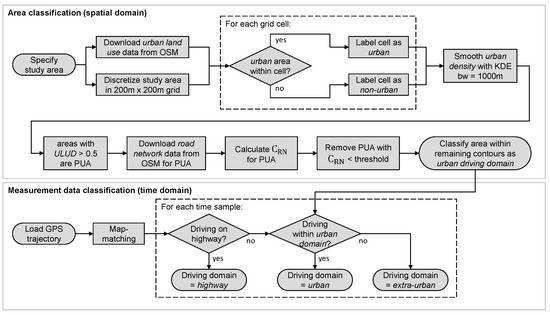 Based on the presented approach, further research is needed to analyse the characteristics of urban and extra-urban driving domains with regard to traffic density, vehicle trip length, and driving behaviour, among other parameters. Lastly, the presented methodology can be used in other geospatial analyses, e.g., to preliminarily identify the relevant spatial extent of the settlement under investigation.