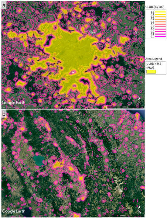 Satellite image with ULUD contours and area patches with ULUD > 0.5 for: (a) the metropolitan region of Paris, map image: Google, Landsat/Copernicus, Data SIO NOA A, U.S. Navy, NGA, GEBCO; and (b) the region of Perugia, map image: Google, Landsat/Copernicus.