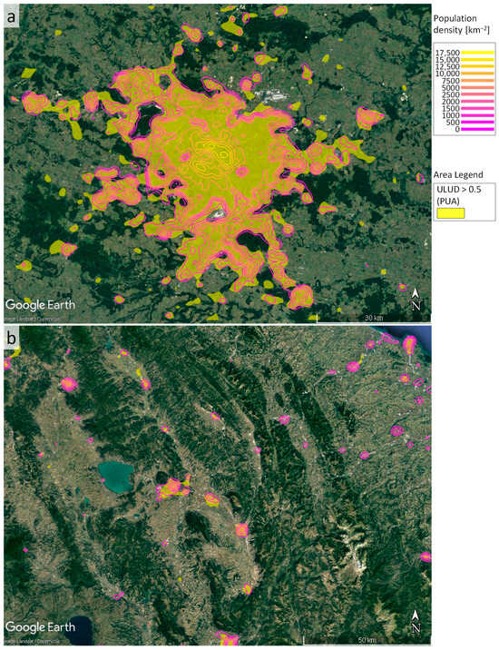 As can be seen in Figure 4b, the identified areas with high ULUD cover only the core and highly populated area within the administrative boundaries of Perugia. Both for Paris and Perugia, ULUD provides results for the distribution of potential urban areas even in areas far from the respective urban core, where population density is too low to provide any further insight.
