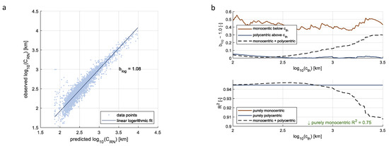 Therefore, a road network capacity threshold was introduced, above which the polycentric scaling model is applied, and below which the monocentric scaling model is used. Figure 6b displays two quality metrics of the model for a varying threshold The deviation between the logarithmic slope and the ideal logarithmic slope is shown in the top half for the monocentric, polycentric and combined models, while the coefficient of determination is displayed in the bottom half for the combined model as well as the purely monocentric and purely polycentric model. As can be seen, a threshold value of provides the best model agreement regarding and for the combined model. However, the monocentric scaling model shows poor performance across all threshold values and the increase in the combined model accuracy towards the optimum resulted mainly from the polycentric model gaining quality of fit.