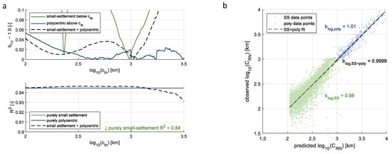 Again, the threshold is varied for the combined polycentric scaling model (Equation (4)) and small settlement scaling model (Equation (5)). Figure 7a shows the resulting deviations between and for both separate models and the combined model as well as the coefficients of determination for the combined model as well as for the pure polycentric and pure small settlements model. As can be seen, the best model agreement is achieved for a threshold of . The log–log diagram for the combined model with this threshold value is displayed in Figure 7b. This threshold is used in the following to distinguish between urban and extra-urban areas for all PUAs.