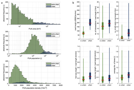 (a) Frequency distribution of area, population, and population density for urban and extra-urban settlements; and (b) boxplots of selected road infrastructure features for urban and extra-urban settlements.