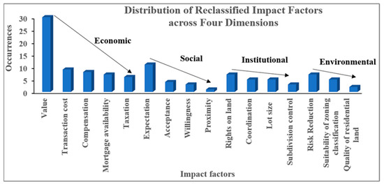 The concepts of environmental sustainability, economic sustainability, and social sustainability were viewed as encompassing broader ideas but were ultimately excluded from categorisation as specific impact factors. Nevertheless, they still signify broader impact areas within their respective dimensions. As shown in Figure 3, the desktop review determined 16 land market impact factors across all dimensions with varying degrees of occurrence, as shown on the vertical axis. Land value, transaction cost, mortgage availability, compensation, and taxation were identified as the land market impact factors across the economic dimension. The factors of rights on land, lot size, coordination, and subdivision controls were identified across the institutional dimension. Within the environmental dimension, the factors of risk reduction, suitability of zoning classification, and the quality of residential land were identified. Finally, the factors of social expectations, proximity, willingness to support land use implementation, and the acceptance of land use planning were found to be impact factors across the social dimension. The impact factors across the economic dimension were rated highest, with around 56% of total occurrences. The impact factors across the environmental dimension were rated lowest, covering approximately 10% of total occurrences. The factors across the institutional and social dimensions had occurrence percentages of 20% and 18%, respectively. When compared individually, the maximum occurrence of the reclassified land market impact factors was associated with the ‘value’ of land, a factor associated with the economic dimension of land market assessment.