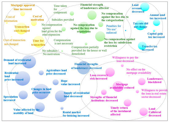 Primary data collected through the interviews were processed in QDA Miner software for descriptive and link analysis. The analysis of interview data showed interrelated clusters of responses across the economic, social, environmental, and institutional dimensions which, after closer analysis, converge to key themes at a higher level. Each of these broadly identified key themes represented an amalgamation of relevant responses. The cluster of coded responses across the economic dimension as analysed and visualized in QDA minor software is shown in Figure 4. Across the economic dimension, clusters were found to be related to changes in the land price or value, transaction cost, taxation, mortgage availability, and compensation against the loss caused by the implementation of land use regulation. The size of each code is proportional to the volume of responses provided by the respondents (Figure 4).