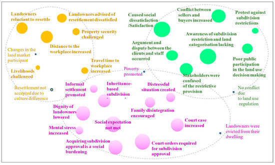 Terms such as transparency, openness, social sustainability, desirability, clarity, expectations, employment, and identity were evident in the social dimension, suggesting that land use regulation may lead to dissatisfaction among market participants by not meeting their expectations. These terms were reclassified as the impact factor ‘expectation’. Likewise, impact factors such as ‘willingness’ was used to represent the terms ‘self-interest, public interest or competitiveness’. Other terms like ‘customer satisfaction’, ‘satisfaction’, ‘distrust’, ‘injustice’, ‘stress’, ‘dissatisfaction’, and ‘social and cultural acceptance‘ were linked to stakeholders choosing whether to accept or reject the land use restriction and therefore were reclassified under ‘acceptance’. Likewise, the term ‘proximity’ was recognized. However, the term ‘cognitive capacity’ and some other generic social terms were omitted from consideration as a factor influencing the land market.