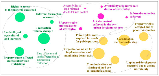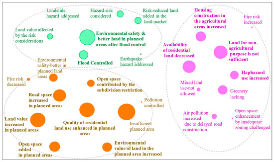 Three clusters of recurring responses were identified across the environmental dimension related to risk reduction, quality of residential land in planned areas, and haphazard or unplanned land use, with the size of the circle being proportional to the number of responses (Figure 6).