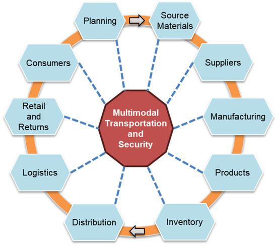 Technological Innovations: The literature highlights the potential for innovation and technology in enhancing security and efficiency in supply chains [38]. Intellectualization, innovation, and modern technologies are key to addressing modern supply chain complexities [39,40,41]. Blockchain and IoT are pivotal in enhancing security and efficiency, offering real-time monitoring and data collection.