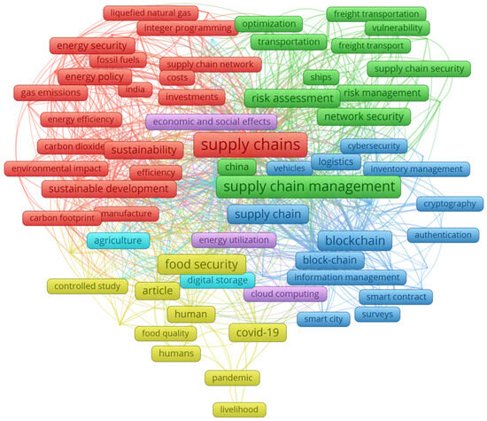 The terms “supply chain”, “supply chains”, and “supply chain management” appear centrally in the map, reflecting the search criteria and indicating their high frequency of occurrence within the corpus. These terms connect to multiple clusters, reflecting their interdisciplinary nature and centrality to the research field. The lines connecting the terms represent the co-occurrence relationships, with thicker lines indicating higher co-occurrence frequencies, representing stronger connections. The dense network of connections highlights the interrelatedness of various topics within the field. The presence of terms like “blockchain”, “smart contract”, and “cybersecurity” suggests the growing importance of digital technologies and data security in supply chain management and transportation security. The variety of terms and clusters depicted in the map highlights the diverse research focus areas within these fields, ranging from sustainability and energy efficiency to risk management, technological advancements, and the socio-economic impacts of the COVID-19 pandemic.