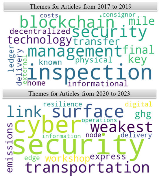 The thematic analysis revealed a progression from a primary focus on balancing technology-driven security with operational efficiency to a more integrated approach that encompasses environmental sustainability and cyber resilience. Figure 4 visually represents this shift, which illustrates the predominant keywords from the articles published in both the pre- and post-COVID cohorts. The word cloud in Figure 4 highlights the frequency of specific terms, providing a visual representation of thematic saturation across different periods.