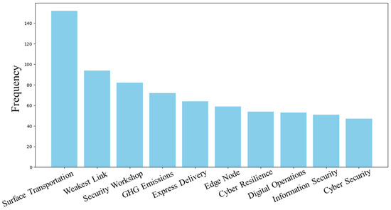 In the post-COVID cohort, the themes evolved to include environmental sustainability (e.g., keywords include “emissions”, and “ghg” meaning greenhouse gas) and cyber resilience. Figure 6 showcases the top bigrams from the post-COVID cohort, highlighting the thematic shifts and new priorities that emerged in the literature. This figure helps illustrate how the pandemic influenced the focus of research towards more holistic and resilient supply chain strategies. That is, the literature expanded to address not only the dual objectives of security and efficiency but also the broader goal of creating a resilient and sustainable supply chain ecosystem. This shift reflects a growing recognition of the need to adapt transportation security strategies to contemporary challenges like environmental sustainability and the increasing threat of cyberattacks.
