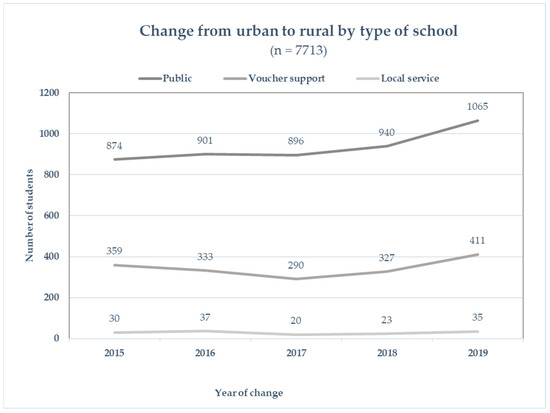 After the previous review, with all students in sixth grade in 2020 (n = 221,265; Figure 1), a subset was selected consisting only of students who were enrolled in rural schools in 2020 (n = 26,611). Figure 4 shows the change from urban to rural facilities between 2015 and 2020.