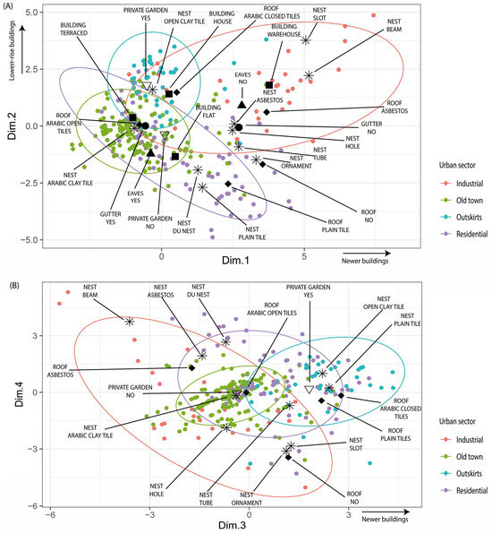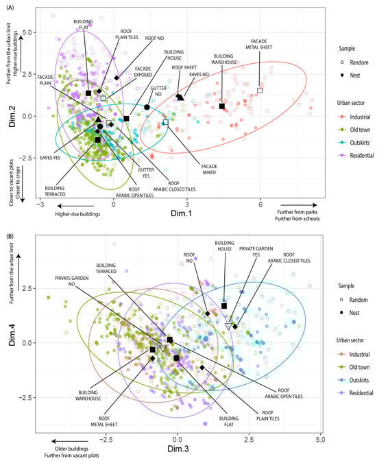 Available habitat (random sample) and selected nesting sites (nest) of the House Sparrow, ordered in the first four FAMD dimensions ((A): Dim.1 vs. Dim.2; (B): Dim. 3 vs. Dim.4), showing the most relevant categorical and numerical variables and the link between them in the four urban sectors. Nests are represented with filled circles and random locations are shown with empty circles, both coloured according to the urban sector. The black symbols identify the levels of the most relevant categorical variables: square (building type), triangle (eaves), diamond (roof), empty inverted triangle (garden), and circle (gutter). Levels within categorical variables are identified by text connected with a line to the symbol. The 95% confidence ellipses are shown with colours corresponding to the urban sector. The arrows identify continuous variables with stronger correlations with each selected dimension (refer to Table 4 and Supplementary Figure S2 for more information).