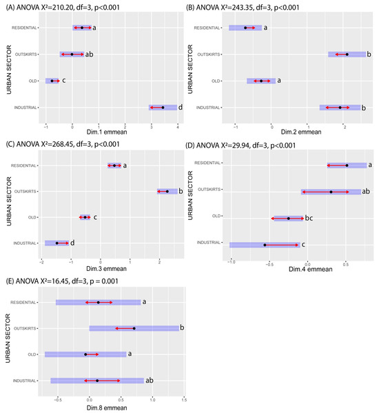 Mean values of each selected FAMD dimension ((A), Dim 1; (B), Dim 2; (C), Dim 3; (D), Dim 4; (E), Dim 8) of nests located in the four urban sectors identified in the study area. The blue bars are confidence intervals for the emmeans, and the red arrows indicate comparisons among them. If an arrow from one mean overlaps an arrow from another group, the difference is not considered “significant”, based on the “tukey” adjustment setting and the value of alpha (0.05).
