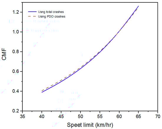 The connection between the CMF and speed limits is depicted in Figure 3. The graph displays the data plotted for total crashes (solid blue line) and Property Damage Only (PDO) crashes (dashed red line). As the speed limit increases from 35 km/hr to 70 km/hr, the CMF significantly increases, indicating a higher likelihood of crashes at faster speeds. Notably, the trends for total crashes and PDO crashes are closely aligned, suggesting a consistent impact of speed on both types of incidents. The graph clearly shows a positive correlation between the speed limit and crash risk, emphasizing the importance of carefully evaluating speed limit settings in traffic safety management to reduce crashes.