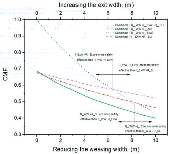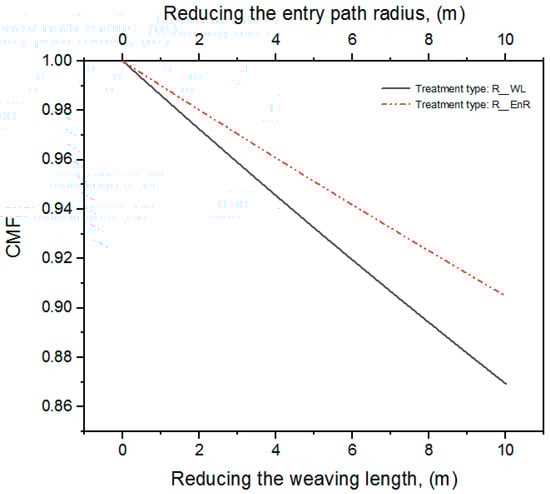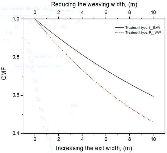 Changing both entry and exit width affects the CMF, as shown in Figure 5. Results indicated that both reducing the entry width and increasing the exit width decreases the CMF. Notably, wider exit width helps in safer lane changing and deceleration; conversely, a narrower entry width reduces vehicle speed and requires more attention by a driver in merging.