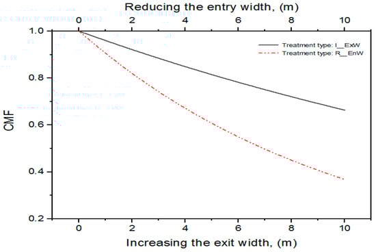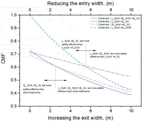 Combined CMFs for exit width, entry width, and speed limit treatments (using PDO crashes). (In this figure, the speed limit treatment is adopted as a speed reduction of 10 kph).