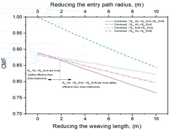 Combined CMFs for weaving length, entry path radius, and entry angle treatments (using severe crashes). (In this figure, the entry angle treatment is adopted as an entry angle reduction of 5°).