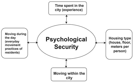 The authors of this article focused on objective factors that can influence the psychological security of individuals residing in urban areas (Figure 1). A review of existing literature revealed the relevance of four factors: