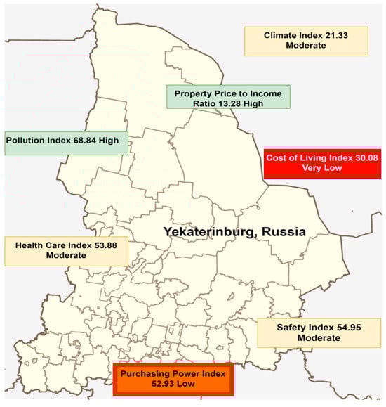 Quality of Life in Yekaterinburg, Russia (by Numbeo [130]). About Numbeo Indices: Climate Index (higher is better) is an estimation of the climate likability of a given city or a country. It is in the range [−100, +100] (higher is better) [131]. Property Price to Income Ratio (lower is better) is a fundamental measure for apartment purchase affordability, where a lower ratio indicates better affordability. It is typically calculated as the ratio of median apartment prices to median familial disposable income, expressed as years of income [132]. Pollution Index (lower is better) is a scale ranging from 0 to 100 [133]. The Cost of Living Indices (lower is better) are relative to New York City (NYC), with a baseline index of 100% for NYC [134]. Health Care Index (higher is better) is a scale ranging from 0 to 100 [135]. The Safety Index (higher is better) is a scale ranging from 0 to 100 [136]. The Purchasing Power Index (higher is better) is relative to New York City (NYC), with a baseline index of 100% for NYC [134].