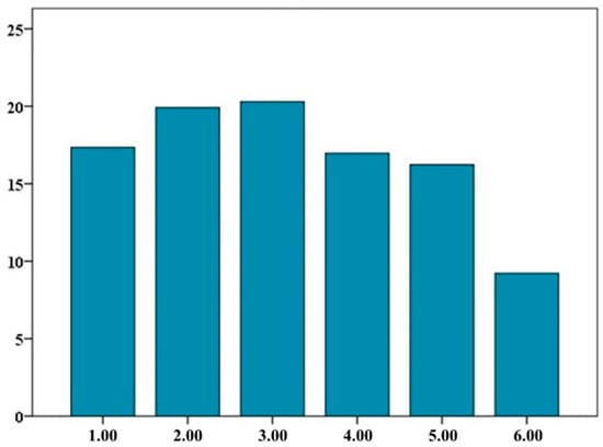 The Distribution of Sample Respondents by Age Group (%). 1.00—20–25 years; 2.00—26–35 years; 3.00—36–45 years; 4.00—46–55 years; 5.00—56–66 years; 6.00—over 66 years.