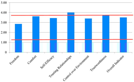 As illustrated in Figure 5, the red axes delineate the limits of the confidence interval, which is defined on the basis of the mean and standard deviation values derived from the standardization sample [144]. Therefore, the findings indicate a prevailing tendency among respondents in Yekaterinburg to perceive their level of psychological security as average or above, with all private and integral indicators falling within the normal range. To illustrate, residents of Yekaterinburg are, by and large, characterized by a sense of mental well-being, a lack of anxiety or distress, and a resilience that allows them to adapt to stressful situations without experiencing overwhelming feelings of anxiety or frustration. The residents of Yekaterinburg have established reliable, open, and trusting relationships with specific individuals who are willing to provide support, assistance, protection, and active listening. These individuals serve as a source of reliability and safety, allowing residents to be open and act without fear of negative influence or exploitation. The residents of Yekaterinburg have had a predominantly positive experience of interaction with their surrounding environment. They have been able to enjoy a sense of stability and security, and they have also been able to successfully overcome various threats (past). This experience engenders a sense of predictability regarding forthcoming circumstances, and individuals perceive their future in a positive light, as one that is replete with possibilities and devoid of insurmountable threats (future). Our findings align with those of other researchers, who have also observed that the majority of individuals tend to experience a sense of security [145,146].