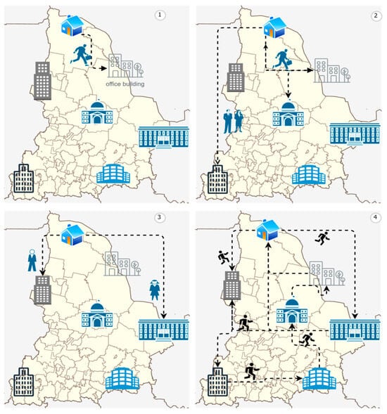 - The movement of individuals during their day-to-day activities (also referred to as daily movement practices). This includes the trajectories of activities such as “home–work”, “home–shop”, “home–work–work–shop–restaurant”, and so on, i.e., the typical patterns of movement of urban dwellers throughout a single day.