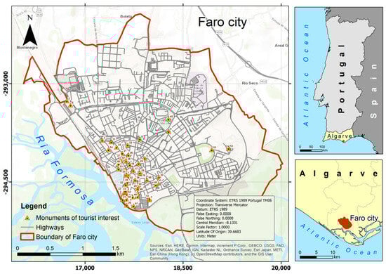 According to the 2021 Census [], Faro has 67,622 inhabitants, and in the summer, due to tourism, the population increases considerably. Figure 1 displays the urban boundary of Faro along with the corresponding communication routes providing access to the 54 points of architectural interest. Table 1 shows the name of each monument represented in Figure 1.