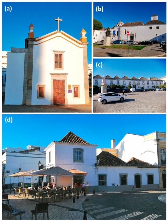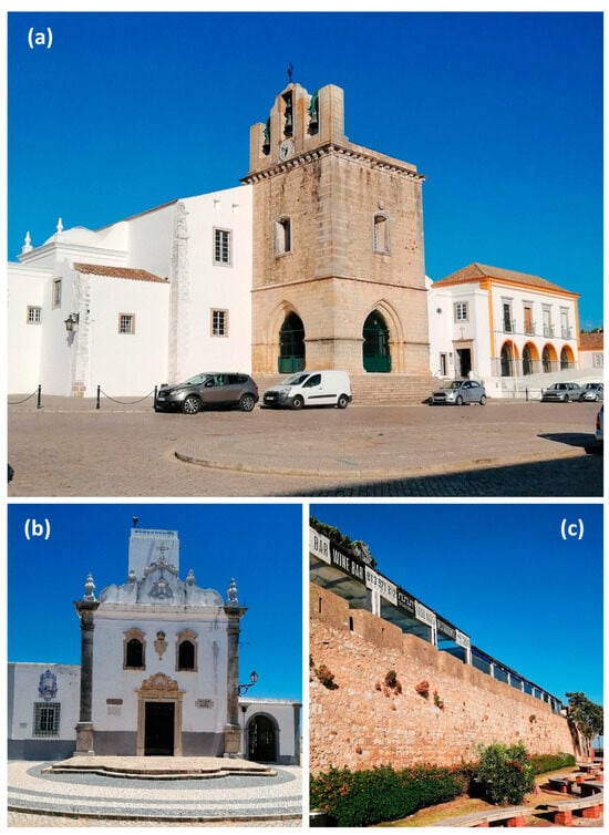 Faro Cathedral, built upon a sequence of ruins (Christian medieval church, mosque, and Roman temple), blends various architectural styles, including Gothic, Mannerist, Portuguese Chã style (16th–17th century), and Baroque [] (Figure 2a). Several Manueline-style chapels of the 14th to the 15th centuries are scattered around the city. An example is the Ermida do Santo António do Alto, built in the second half of the 15th century and added to a Gothic-medieval watchtower from the 14th century [] (Figure 2b). The Fortress of Faro, dating back to Roman occupation in the 1st and 2nd centuries and expanded during the Arab conquest in the 9th century, features a Ravelin to the south constructed during the reign of D. Sebastião (1557–1578), designed to defend the city against sea invasions [] (Figure 2c).