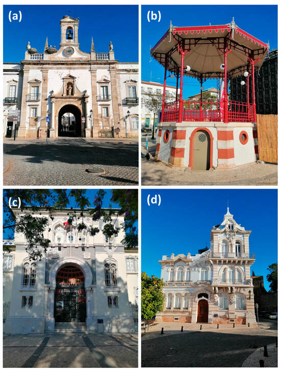 (a) Arco da Vila, (b) Bandstand, (c) Bank of Portugal Palace, (d) Belmarço Palace (Source: The authors).