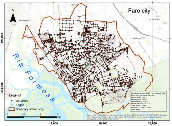 Figure 6 shows Faro’s network dataset, characterized by a connected structure with a total length of 143 km. The dataset includes 2095 nodes (junctions) and 2912 arcs (edges), with an average arc length of 49 m. The degree to the input and output of junctions has a maximum value of 2. The impedance associated with each edge corresponds to the distance from the edge.