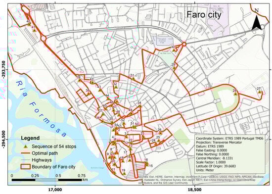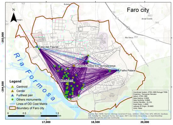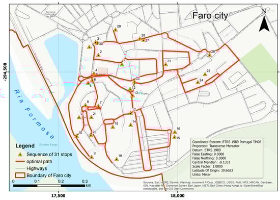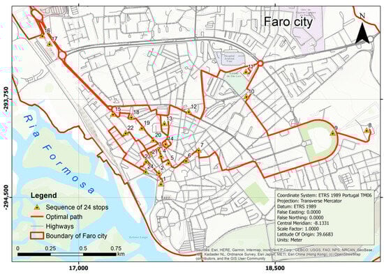 The file containing monument coordinates in ETRS89-TM06 was converted to a shapefile. In ArcGIS, the files containing urban roads and monuments from Faro were converted into feature classes within a personal geodatabase. A network dataset was created using the feature class of urban roads with an “endpoint” connectivity policy. The cost function used was “distance”, and the mode of transport was an e-scooter. Three sets of visiting points were defined: 54 monuments refer to the number of architecturally interesting monuments within the city, 31 monuments are in the city center (old town), and another set of 24 monuments is situated outside the old city.