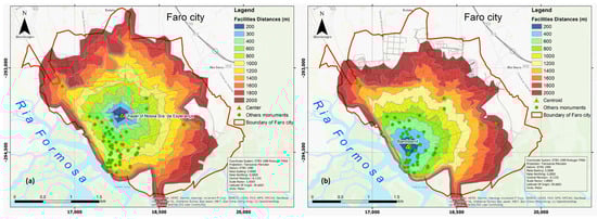 (a) Facilities Distances to the Chapel of Nossa Senhora da Esperança and (b) Facilities Distances to the Bandstand (Source: The authors).