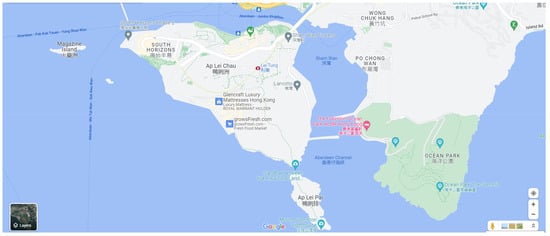 Ap Lei Chau Island is a small and densely populated outlying island where almost 80,000 people live in an area measuring 1.3 km2 (about half a square mile) in Hong Kong, geographically belonging to the Aberdeen area in the southern administrative district of Hong Kong [19]. The sea between Ap Lei Chau and Aberdeen is the typhoon shelter area for ships and yachts. This geographical advantage has led to a high concentration of fishery activity, creating a fishing village in the Ap Lei Chau-Aberdeen area [20]. A bridge connects Ap Lei Chau Island to Aberdeen and provides access to the nearby commercial and industrial area named Wong Chuk Hang. The geographical shape of Ap Lei Chau resembles a smaller version of Hong Kong Island. The southern and middle areas of Ap Lei Chau are hills. The entire island is mainly for residential use, concentrated in the western and northern areas. A small industrial area on the island’s southwest corner also provides furniture outlet sales and information technology services such as data centers. The geographical location of Ap Lei Chau Island is shown in Figure 1.
