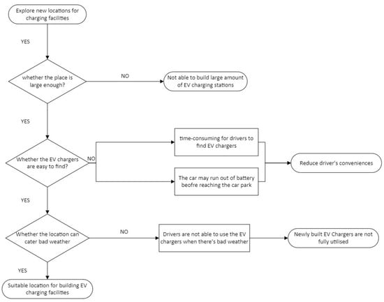 In past research studies, researchers have focused on the preferences and perceptions of EV charging stations. Ref. [5] carried out a user-centered assessment of fast-charging stations to investigate user preferences and preferred locations for charging stations. Subsequently, Ref. [6] used statistical approaches and identified gas stations, workplaces, and motorway service stations as the most preferred locations for EV charging. Ref. [7] criticized such past research studies as rather outdated. In addition, Ref. [8] summarized that various researchers mainly concentrated on the key topics of EV charging stations, including the heuristic EV charging placement, the coverage problem, the traffic network equilibrium problem, and the flow-capturing method.