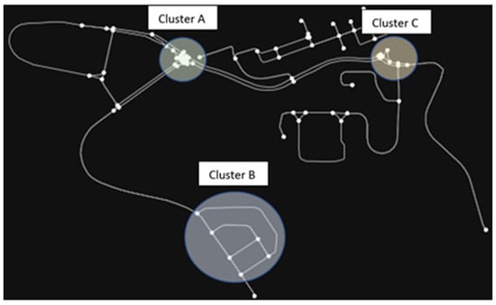 After the decision criteria were processed via the above flowchart, three clusters were identified by clustering analysis according to the geographical situation of Ap Lei Chau Island. Cluster analysis refers to the process of dividing potential charging station locations on Lei Chau Island into different groups or clusters based on geographical location, accessibility, and proximity to residential, commercial, and industrial areas. This method helps identify areas where charging stations would be most beneficial and convenient for users. The clusters include Cluster A, near private housing estates; Cluster B, an industrial and commercial area; and Cluster C, an area near a home ownership scheme housing estate. After that, the topological network from the traffic map is generated, with the necessary driving point (the white dots), as shown in Figure 3. Lastly, the driving nodes of each cluster have been identified, and the associated mean point has been calculated.