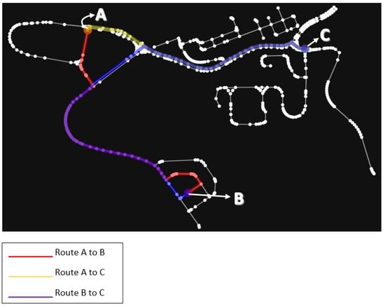 The following map has been generated with three corresponding routes as shown in Figure 4, Figure 5 and Figure 6: (i) from Cluster A to Cluster B; (ii) from Cluster A to C; (iii) from Cluster B to C.